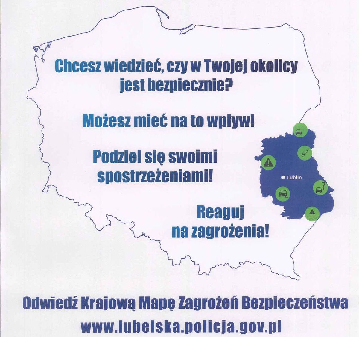Do dokonania zgłoszenia na Krajowej Mapie Zagrożeń Bezpieczeństwa wystarczy komputer lub telefon z dostępem do Internetu. Po uruchomieniu aplikacji oznaczamy miejsce i wybieramy rodzaj zagrożenia, które chcemy zgłosić. Korzystanie z mapy nie wymaga podania danych osobowych. Za jej pośrednictwem możemy informować o wielu sytuacjach, które z naszego punktu widzenia są bardzo istotne dla zapewnienia bezpieczeństwa w powiecie chełmskim. Każde zgłoszenie na mapie weryfikowane jest przez policjantów, a w przypadku jego potwierdzenia eliminowane lub przekazywane do innych podmiotów, jeżeli dotyczy ich działalności.