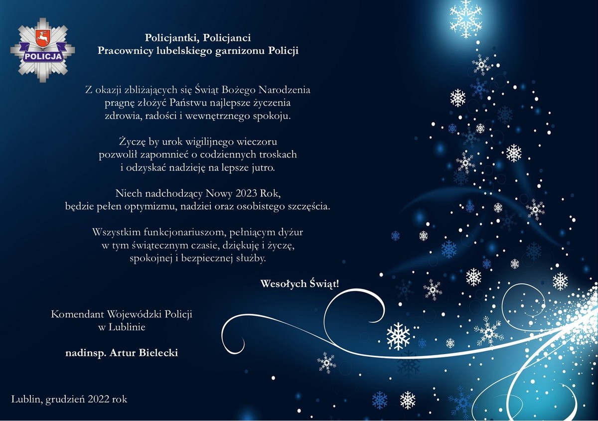 Policjantki, Policjanci, Pracownicy lubelskiego garnizonu Policji. Z okazji zbliżających się Świąt Bożego Narodzenia pragnę złożyć Państwu najlepsze życzenia zdrowia, radości i wewnętrznego spokoju.