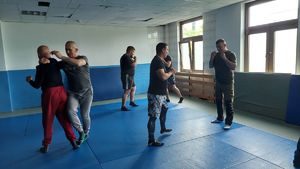 Grupa ratowników medycznych, pod okiem doświadczonych policyjnych instruktorów, zdobywała wiedzę z zakresu podstaw samoobrony i obezwładniania w sytuacji odpierania ataku agresywnego przeciwnika. Część zajęć przeprowadzona była w karetce, gdzie policjanci instruowali w jaki sposób bezpiecznie transportować agresywnego pacjenta.