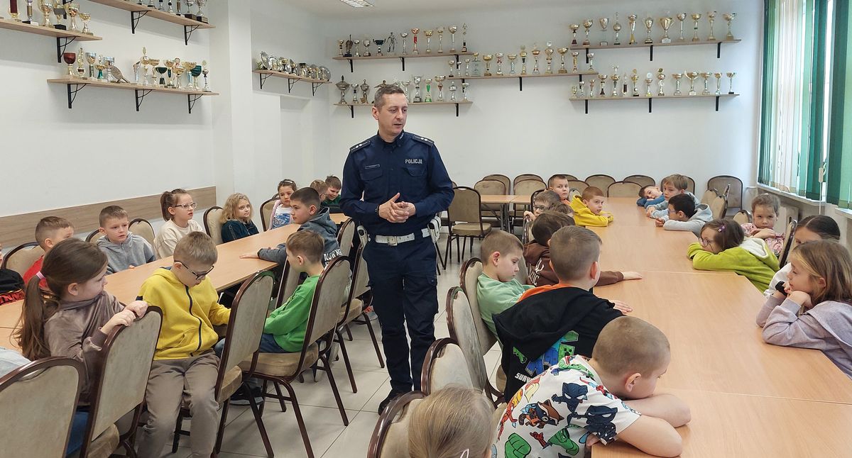Podczas prowadzonej prelekcji w klasach 1-3, mundurowi przypomnieli o zagrożeniach, które mogą pojawić się w trakcie tego zimowego wypoczynku. Omówili też zasady bezpieczeństwa podczas uprawiania sportów zimowych oraz gier i zabaw na świeżym powietrzu. Przestrzegali przed wchodzeniem na zamarznięte zbiorniki wodne oraz zjazdem sankami wprost na jezdnię.
