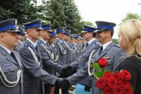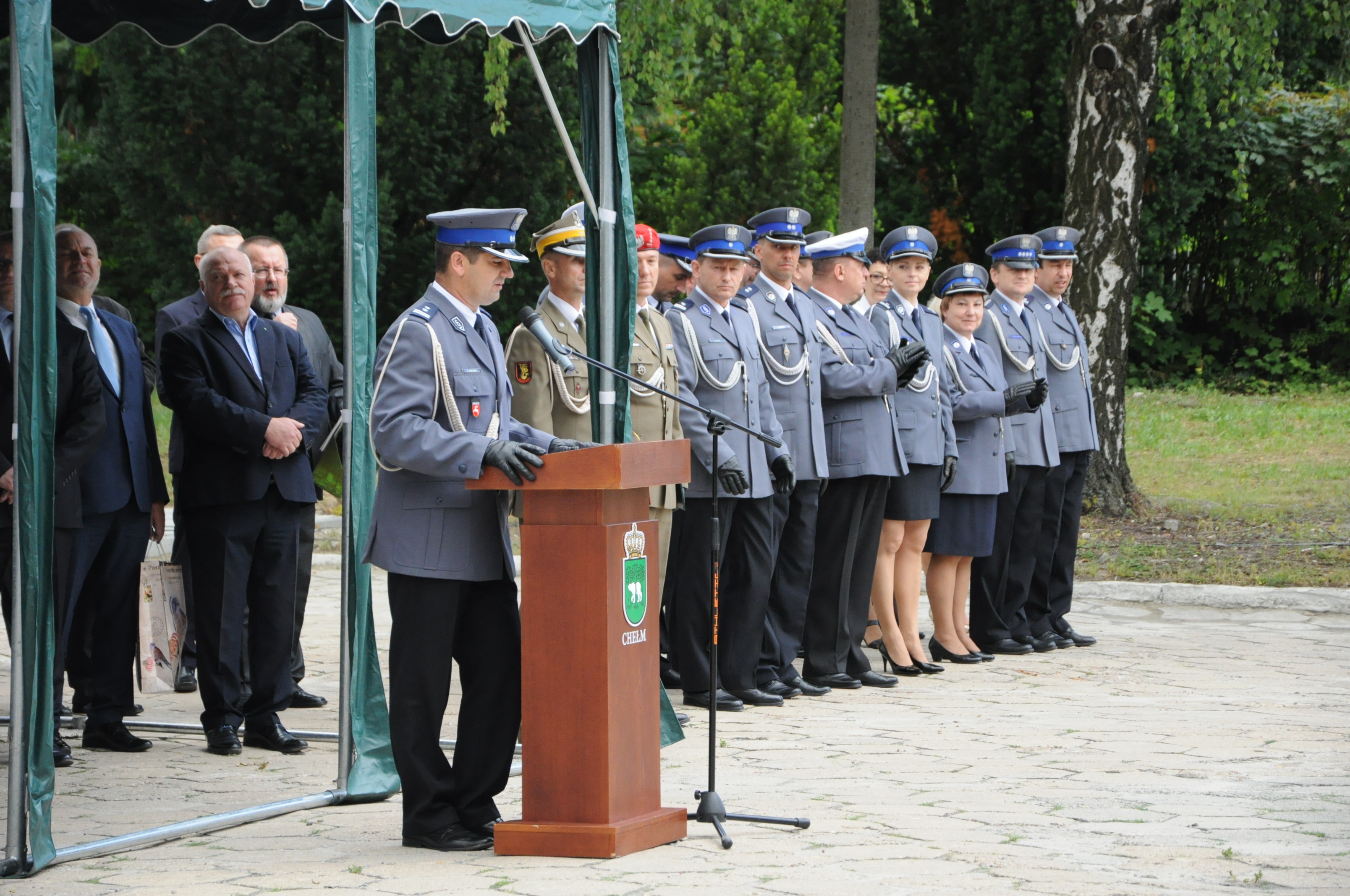 Dzisiejsze obchody Święta Policji rozpoczęły się mszą świętą, która odprawiona została o godz. 9.00 w Bazylice p.w. Narodzenia Najświętszej Maryi Panny w Chełmie. Następnie o godz. 10.00 na placu apelowym przed budynkiem komendy odbył się uroczysty apel, w którym uczestniczył Komendant Wojewódzki Policji w Lublinie insp. Paweł Dobrodziej oraz zaproszeni goście. Swoją obecnością zaszczycili nas przedstawiciele parlamentu, urzędu marszałkowskiego, władz samorządowych, służb mundurowych i różnych instytucji, z którymi na co dzień współpracuje Policja. Podczas tej uroczystości funkcjonariuszom zostały wręczone awanse na wyższe stopnie policyjne, odznaczenia oraz nagrody pieniężne. W tym roku awansowało 80 funkcjonariuszy. Zaproszeni goście złożyli policjantom życzenia oraz podziękowali za służbę, której efektem jest wzrost poczucia bezpieczeństwa obywateli. Podczas uroczystości przekazane zostały też policjantom urządzenia służące do badania stanu trzeźwości. Głos zabrał również Komendant Wojewódzki Policji w Lublinie, który złożył wszystkim policjantom i policjantkom oraz pracownikom cywilnym życzenia i podziękowania za trud i wytrwałość w realizacji misji jaką powierzyło nam społeczeństwo.