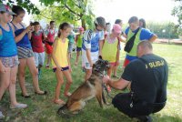 Policjanci zaprezentowali też dzieciom niektóre elementy wyposażenia, jakim na co dzień dysponują stróże prawa. Następną atrakcją było spotkanie z przewodnikiem psa tropiącego, podczas którego owczarek belgijski „Hydro” pokazał na torze przeszkód swoje umiejętności. Na koniec zaprezentowany został dzieciom radiowóz.