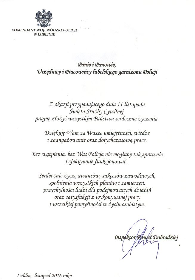ŻYCZENIA OD KOMENDANTA WOJEWÓDZKIEGO POLICJI W LUBLINIE