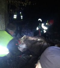 Do nietypowej interwencji z udziałem łosia doszło wczoraj w lesie na terenie gminy Białopole. Zwierzę to zaplatało się w siatkę ogrodzeniową rogami. Wspólne działanie służb doprowadziły do jego uwolnienia. Gdy łoś dostał środki uspokajające, strażacy wykorzystując odpowiedni sprzęt uwolnili go.